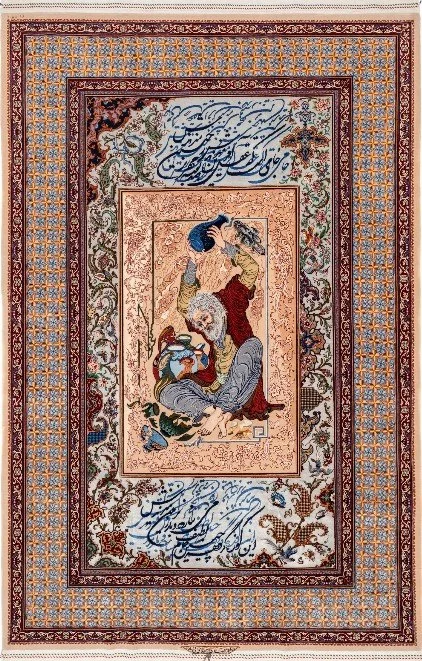 Yadollah, another son of Haj Mehdi, was renowned for his mystical and literary-themed carpets. His works, such as "The Seven Cities of Love" and "Meeting the Creator," are characterized by their intricate designs and profound symbolism. One of his most notable contributions is a carpet depicting scenes from the Day of Ashura, created over 16 years, which is housed in the Astan Quds Razavi museum